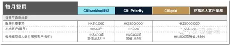 Citi Priority:平均每日最低结余50万港币,不足者按季度收取120港币