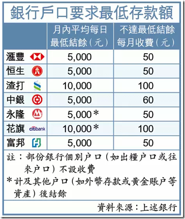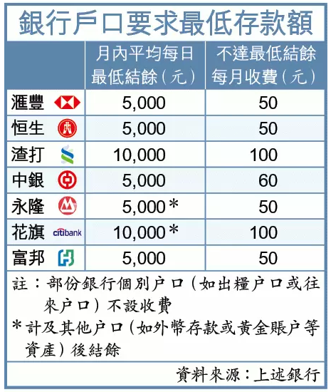 香港的银行一般都有最低存款的限制(一般要求户口内至少有10000港币的存款),如果不足1万(银行会将账户里面过去3个月的每日资产总和包括港币、外币、黄金、股票、基金等,系统会自动折算非港币资产为港币计算,再除以天数计算),会收一定的月费。