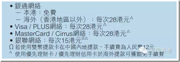 7. 自助柜员机网络:香港柜员机分为两类,一类是汇丰集团旗下的,主要是汇丰银行和恒生银行,另外一类是银通柜员机,是香港其他银行为了对抗汇丰集团联合发起的。两套柜员机系统之间内部转账全免费,互转会收取一定费用。