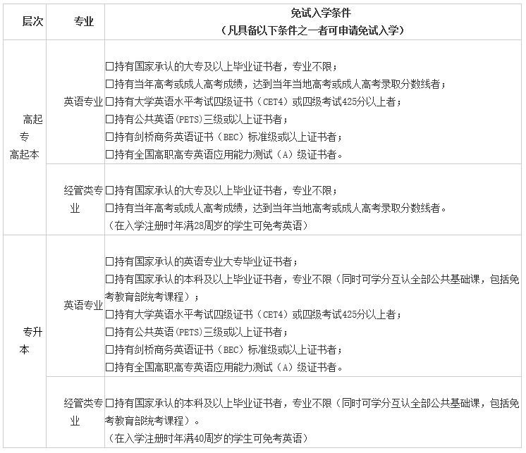 三、经管类专业本科段学生入学注册时年龄满40周岁者,可免考《大学英语(2)》及《大学英语(3)》。