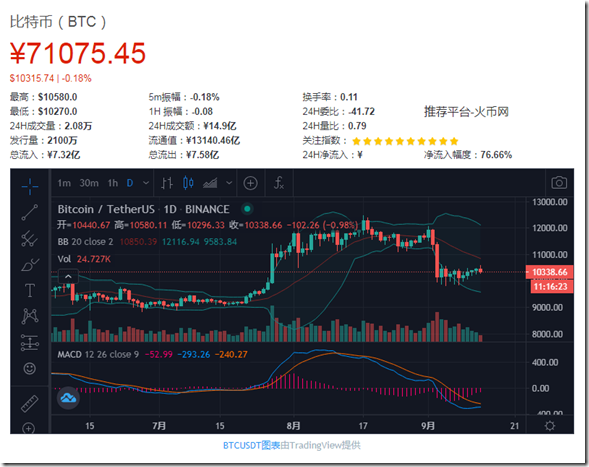 2020年9月13日比特币价格 ¥人民币计价71075.45元 $美元计价 10315.74 美元