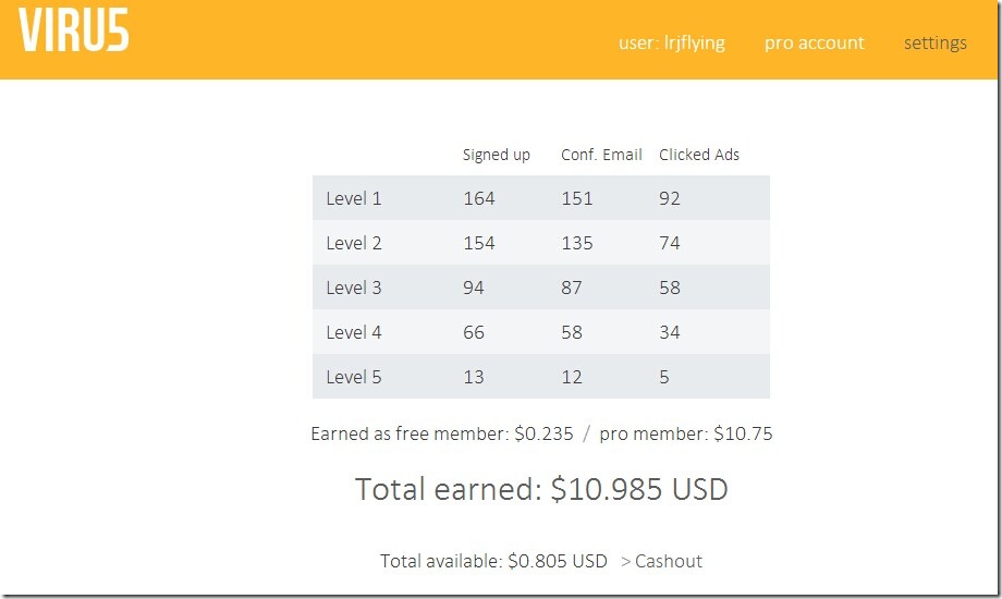 Viru5来自十年老站wordlinx推出的新站,支持五级下线提成,每推广一个朋友,普通会员可获得$0.005,升级会员可获得$0.05,升级费用每年$50。佣金单价虽然不高,但是五级下线的提成,这样算来是十分可观的。假如你推广有50个直接下线,另外他们各自推广有5位朋友的话,那么就的收入就是50 x 5 x 5 x 5 x 5 x $0.05 = $1,562.50 USD。