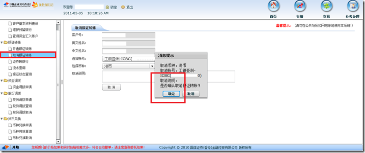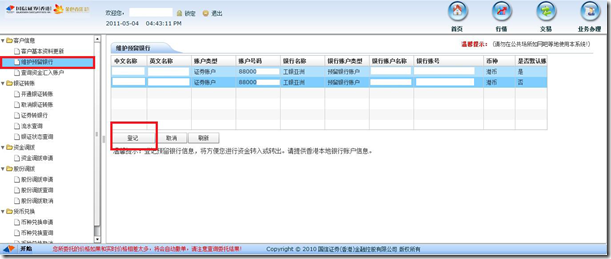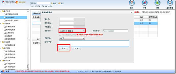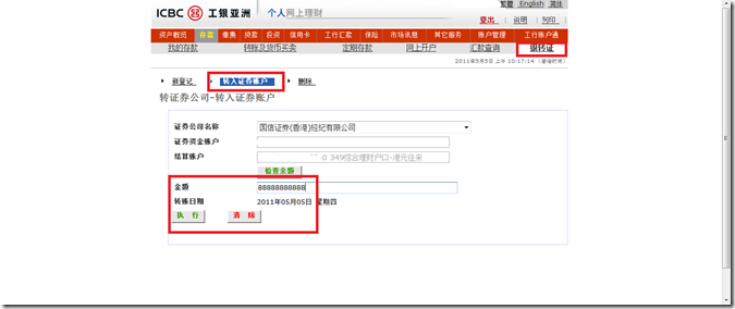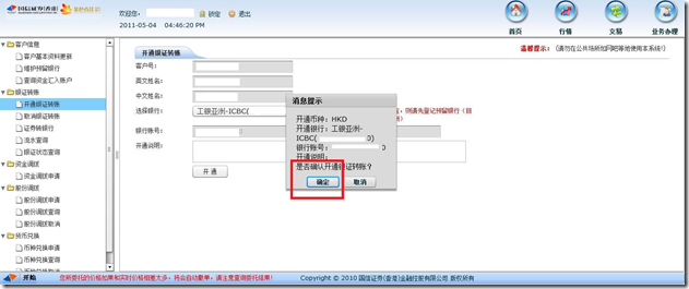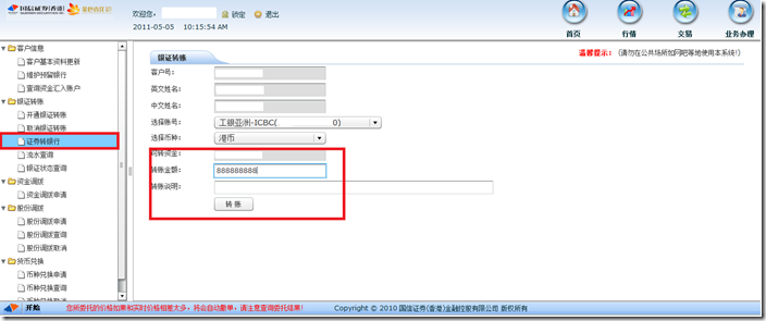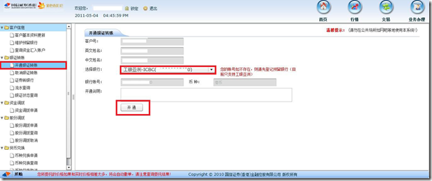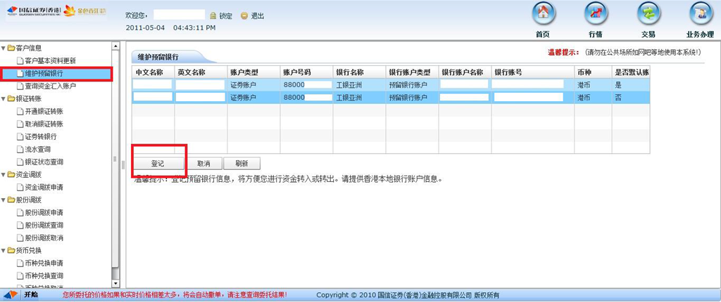 在完成上述登记并开通手续后,客户可通过国信香港及工银香港的网上交易系统进行资金的调拨。