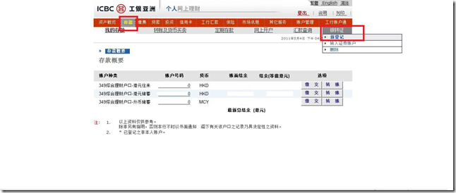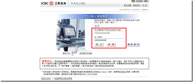 输入您的工银亚洲账户号码及密码,并“确认”