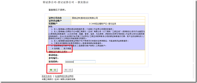 之后您会收到由工银亚洲发出的确认短信,请选择“我同意”,然后输入短信密码并点击“确认”,银证转账服务即时开通。