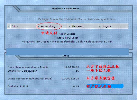 点击 Mitglieder 栏目下的 Auszahlung(目前大约100万点=0.2-0.6 欧左右)后, 出现如下页面: