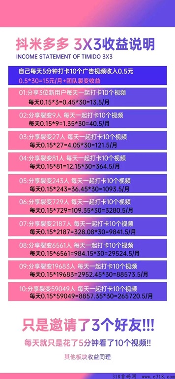 比如,你是我下级,我推广了200个人,那滑落到你下面就是197个,这197个人,每天完成10个广告任务,你的收益是,197×0.15=29.55