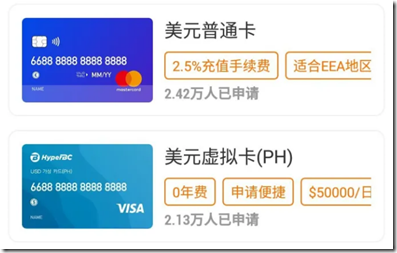 据前期的了解,HyperCard分为美元卡和欧元卡两种卡片类型,美元卡卡种分为银联和visa,均为实体卡,