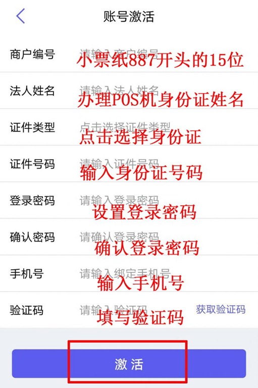 2)按顺序填写账号激活所需资料。商户编号(小票纸商户名称下面就是商户编号887开头的15位),法人姓名填写到账人姓名和身份证号,登陆密码自己设定,手机号填写可以收到验证码的手机号即可,最后输入收到的验证码,点击激活。