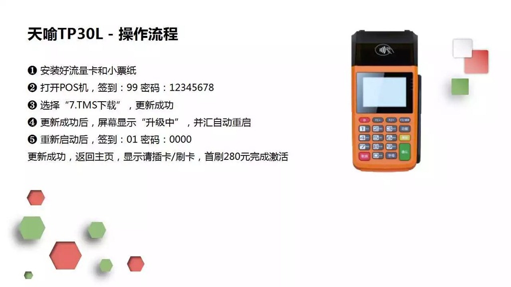 1、长按电源键开机,签到操作员:01,密码:0000 之后按确认键,选择1消费,按提示操作即可;如果交易卡没有闪付功能,可按8其他,然后选择2插卡消费,第一笔输入280,支付机器押金,这280是不到帐的;按机器提示输入密码,签字即可(电子签名,机器下面有一个签名笔,直接在机器屏幕签名即可),手机号可以不需输入,交易完毕,会出小票。