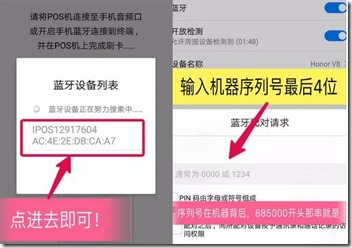 8,刷卡时我们需要打开手机的蓝牙,并且将pos机链接通过蓝牙链接到终端,基本演示如下图