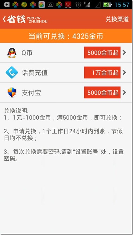 用户可以使用省钱助手每日签到、屏幕解锁、安装系统推荐的优秀应用、分享应用、邀请好友、有奖活动等获取金币。金币可兑换成Q币、话费以及支付宝提现。