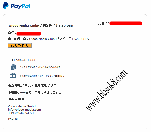 10月14日赤子飞龙收到Ojooo收款$ 6.50 USD美元 最近在Ojooo提款,几天之内就到账了,网站支持中文语言,对国人友好,支付及时,Ojooo信誉不错,值得推荐! 参考相关文章: 德国精品PTC点击站OJOOO注册中文教程 付收款图: