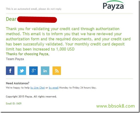 感谢您通过授权方法验证您的信用卡。此电子邮件是通知您,我们已审阅您的授权表格和所需的文件,和您的信用卡已成功验证。你每月的信用卡存款限额已经提高到1000美元