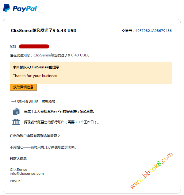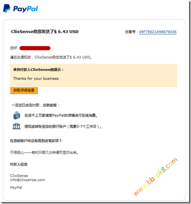 今天收到收到国外ClixSense路由站收款$ 6.43 USD美元