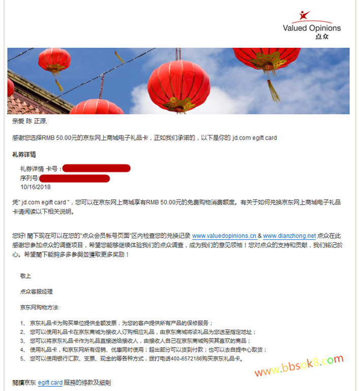 2016年2月6日收到国外点众调查收款RMB 50.00元的京东网上商城电子礼品卡