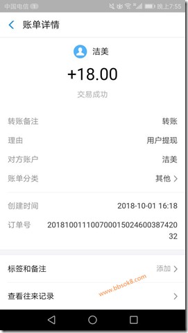 2018年10月1日收到手机赚钱洁美平台收款18元,秒到,大平台值得信赖,赶紧抓住机会赚大钱,限时国庆节日活动只要8.8元购买代理会员!
