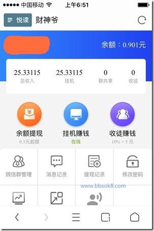 注册好账户,然后进入主页,强烈建议浏览器中添加书签,方便以后进入页面提现,账户满0.3元即可提现到微信钱包,秒到账。