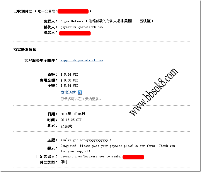 9月12日收到Twickerz付款$ 4.90 USD美元