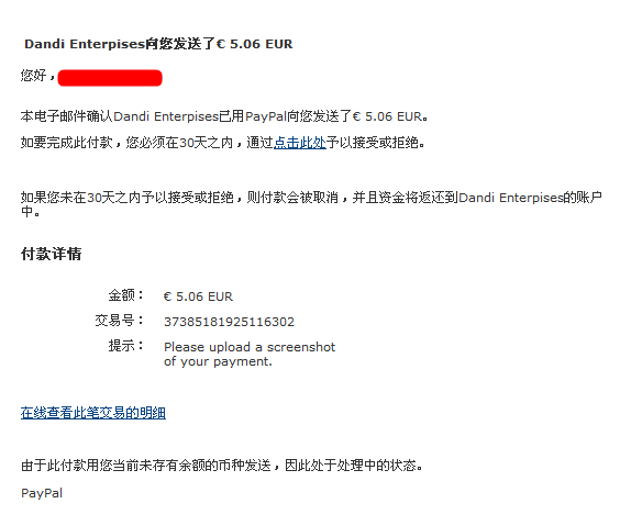 今天上午在国外欧元点击站Dandiptc提款,晚上时候PAYPAL就可以收到€ 5.06 EUR欧元款了,PAYPAL支持多种国家货币,同时在Paypal里面开了一个欧元货币账户,很不错哦!