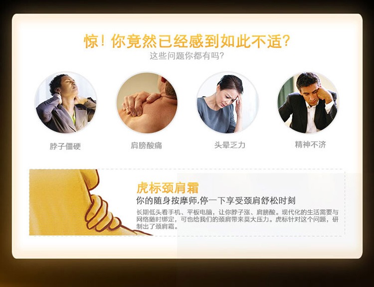 泰国 虎标颈肩霜普通配方舒缓颈椎缓解酸痛霜-红色特强 使用说明书 地产:为泰国制造 使用效果:对肩部,颈椎,颈椎僵硬 酸痛,一擦就有效果。颈椎不好的可以常备,一支为50G,携带也很方便。 送爸妈,送公婆,送亲人,送领导,送客户都是上选的。