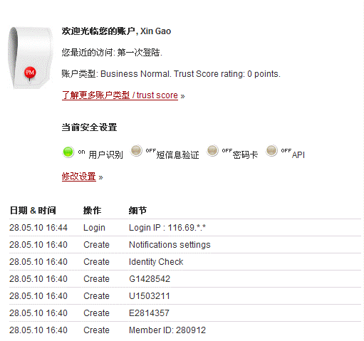 在右上角選擇語言(中文chinese),即全部顯示中文了。帳戶內部可以兌換成歐元,然後電匯回國,還可以在帳戶內兌換e-gold, Webmoney, Pecunix。