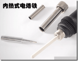 內熱式電烙鐵的發熱絲繞在一根陶瓷棒上面外面再套上陶瓷管絕緣,使用時烙鐵頭套在陶瓷管外面熱量從內部傳導外部的烙鐵頭上,叫做內熱式。內熱式的電烙鐵體積較小,而且價格便宜。一般電子製作都用20W-30W的內熱式電烙鐵。內熱式的電烙鐵發熱效率較高,而且更換烙鐵頭也較方便。