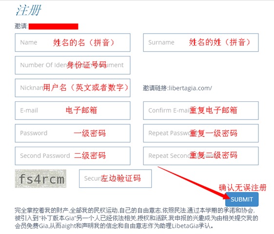 二 、然後按下圖填寫註冊信息(姓名用拼音,左邊是名,右邊是姓,比如:張三,左邊填san,右邊填zhang,姓名和身份證號碼不能出錯,關係到以後要驗證身份提現和申請VISA卡),最後點擊藍色鍵 SUBMIT.(請認真對待註冊信息,必須要用真實身份證號碼,一個身份證,只能註冊一個號,郵箱是找回一,二級密碼的工具,非常重要.可以使用谷歌,163,126,QQ等郵箱)如果使用的是QQ郵箱,一定要設置好QQ的密保功能,方便QQ被盜隨時能找回QQ郵箱)