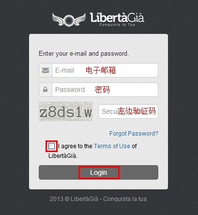 三、 OK,恭喜您註冊成功,請點擊最右上角的 MY ACCOUNT,會出現以下的網頁,輸入您剛剛填寫的電子郵箱和密碼,填寫驗證碼,勾選白色小框,再點擊 Login 登陸(網址為:http://libertagia.com/office/members/login,您可以保存到瀏覽器收藏夾,方便您以後登陸)