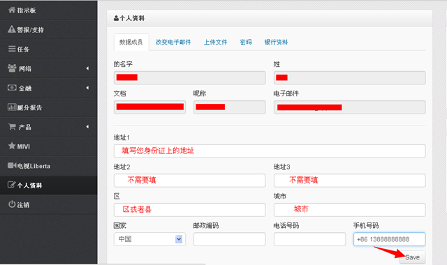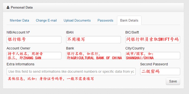 2 後台綁定自己國內的銀行卡提現,在個人資料菜單,選擇銀行資料一欄,按照下圖2填寫您國內銀行卡資料,公司會在四五左右時間通過國際金流電匯到您國內銀行卡,同樣,因為到賬時間長,手續費高,如果不是大額資金提現的話,所以不建議採用!