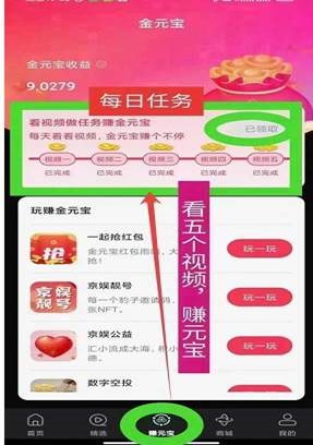 認證完成後自動送15積分任務包,每天點下面的「賺元寶」花3分鐘看5個小視頻,然後領取收益。
