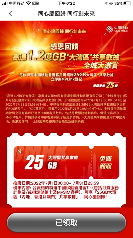 香港回歸25周年,CMHK香港中國移動送25G流量,有效期從領取當天算起60天,可以在中國內地,香港,澳門兩岸三地使用!