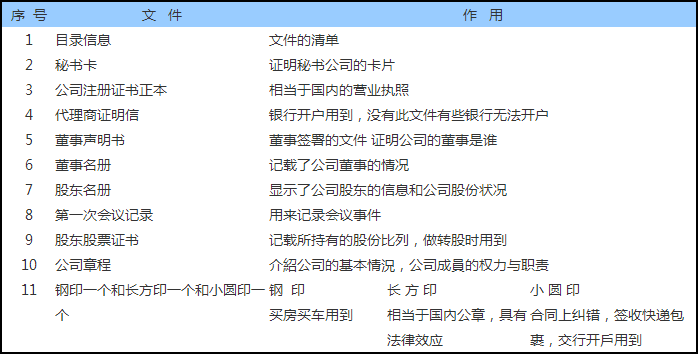 1) 公司註冊證書2) 商業登記證3) 章程4) 股票5) 出任董事同意書6) 鋼印、簽字印7) 董事法定冊子8) 註冊地址通知書9) 首任董事秘書通知書10)公司記錄簿