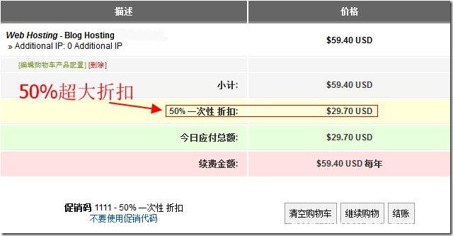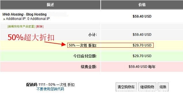 如上圖所示,以HostEase虛擬主機Linux博客型方案為例。發現一年付原價是59.4美元的價格,使用優惠碼1111得到50%優惠之後的價格就是29.7美元了,優惠幅度可謂是歷史最高。