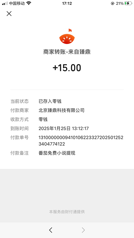 2025年1月25日番茄小說提現15元