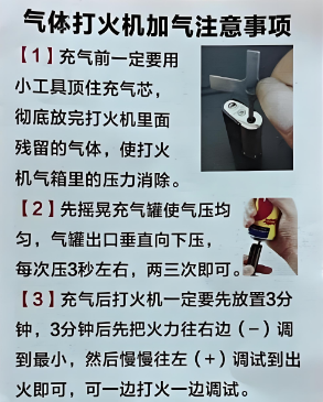 充满后静置一分钟左右,待打火机温度恢复后再打火使用,如果无法打火,可以调大一些气门(打火机不同,调节方法不同)。