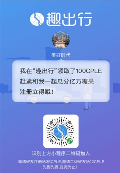 趣出行小程序,每天穩定分紅數月,現在搞活動註冊就送100CPLE,邀請一人就送50CPLE。